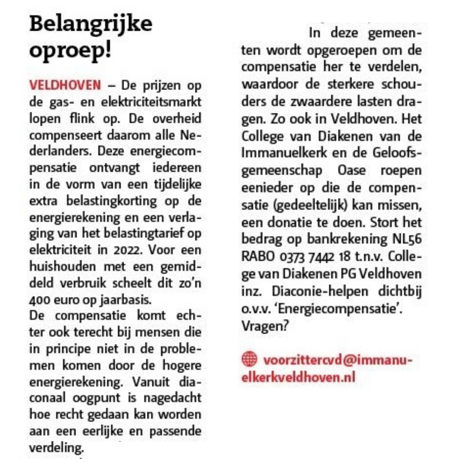 Met de oplopende gas- en elektriciteitsprijzen komen steeds meer huishoudens in de problemen. De overheid gaat daarom alle Nederlanders compenseren. De Immanuelkerk in Veldhoven doet in het Veldhovens Weekblad een oproep tot het herverdelen van de energiecompensatie van de overheid. Met de gedachte ‘𝗱𝗲 𝘀𝘁𝗲𝗿𝗸𝗲𝗿𝗲 𝘀𝗰𝗵𝗼𝘂𝗱𝗲𝗿𝘀 𝗱𝗿𝗮𝗴𝗲𝗻 𝗱𝗲 𝘇𝘄𝗮𝗮𝗿𝗱𝗲𝗿𝗲 𝗹𝗮𝘀𝘁𝗲𝗻’ roepen zij mensen op om wanneer zij een deel van de compensatie kunnen missen, om deze te doneren voor de mensen die het harder nodig hebben.
